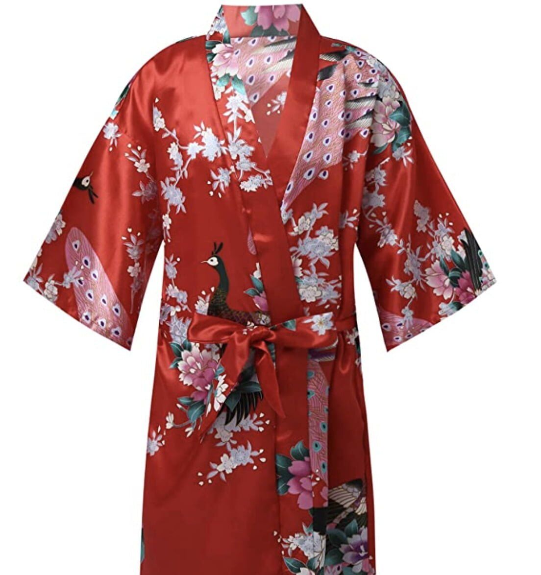 Girls’ Satin Kimono Robe – Peacock and Blossoms RED